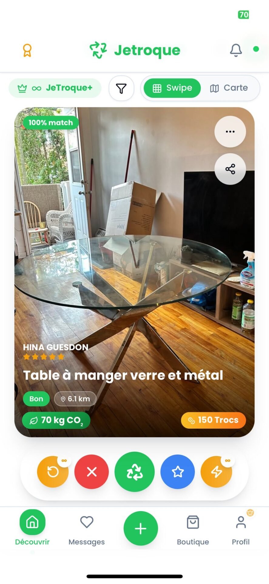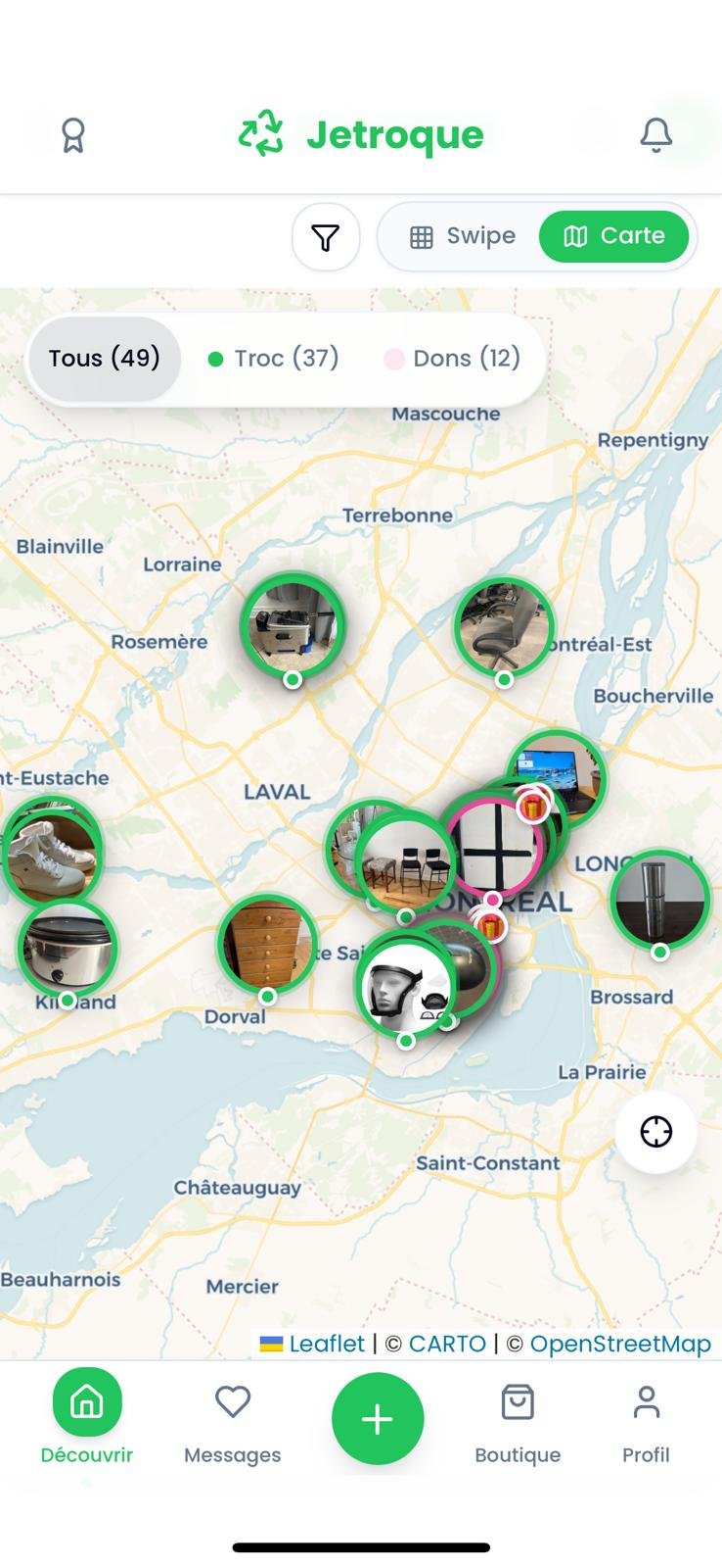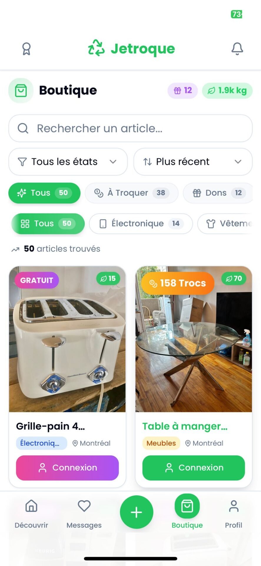 Oui ! L'utilisation de base de l'application (pour lister, donner, et trouver des objets près de chez vous) est 100 % gratuite. Nous proposons également un abonnement optionnel « JeTroque+ » (80 $/an) qui inclut notre service de collecte à domicile.